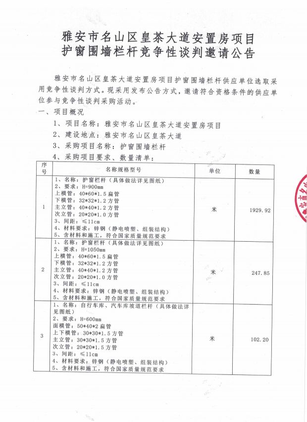 雅安市名山區(qū)皇茶大道安置房項目 護(hù)窗圍墻欄桿競爭性談判邀請公告